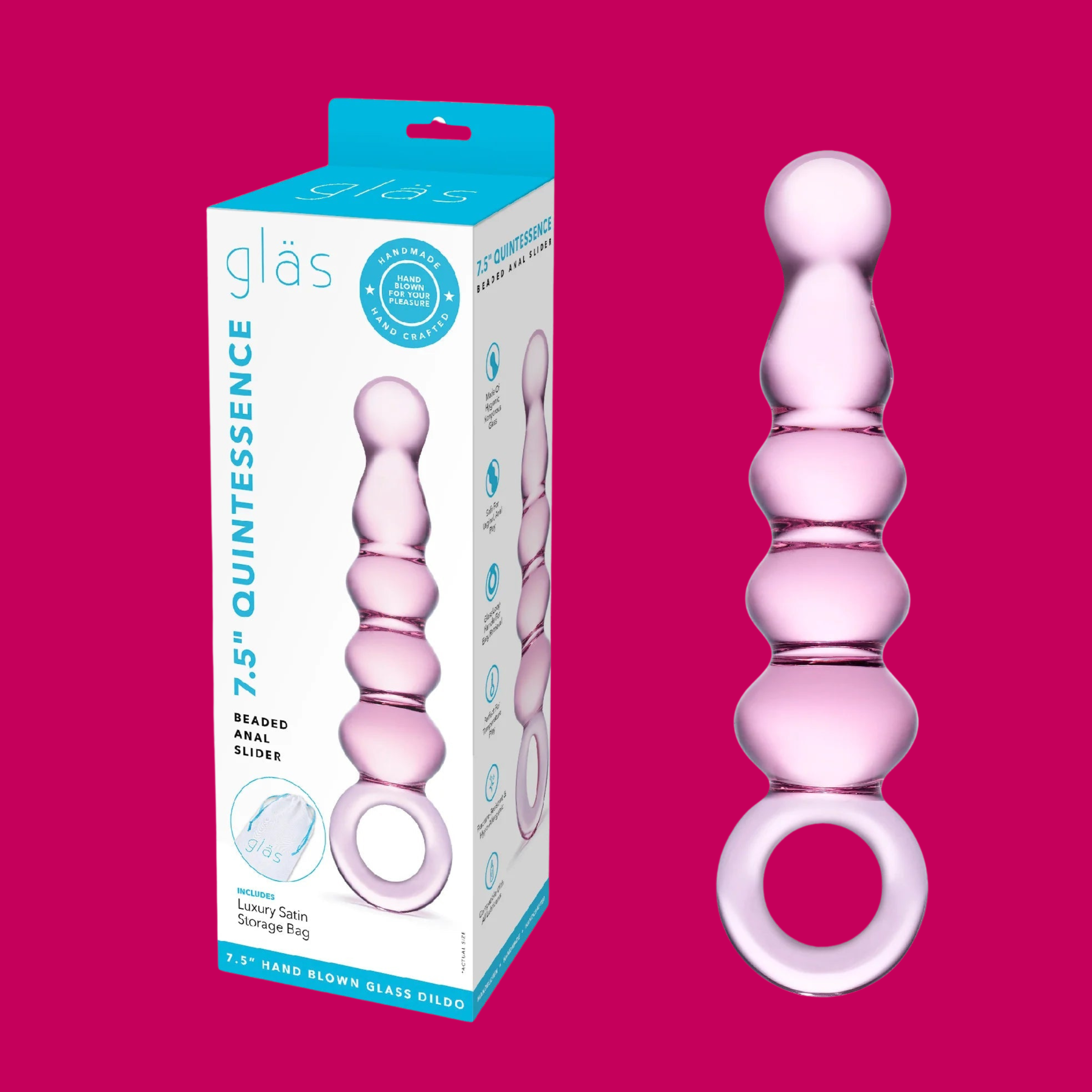 Glas 7.5 in. Quintessence Beaded Anal Slider Glass Dildo with Ring Handle